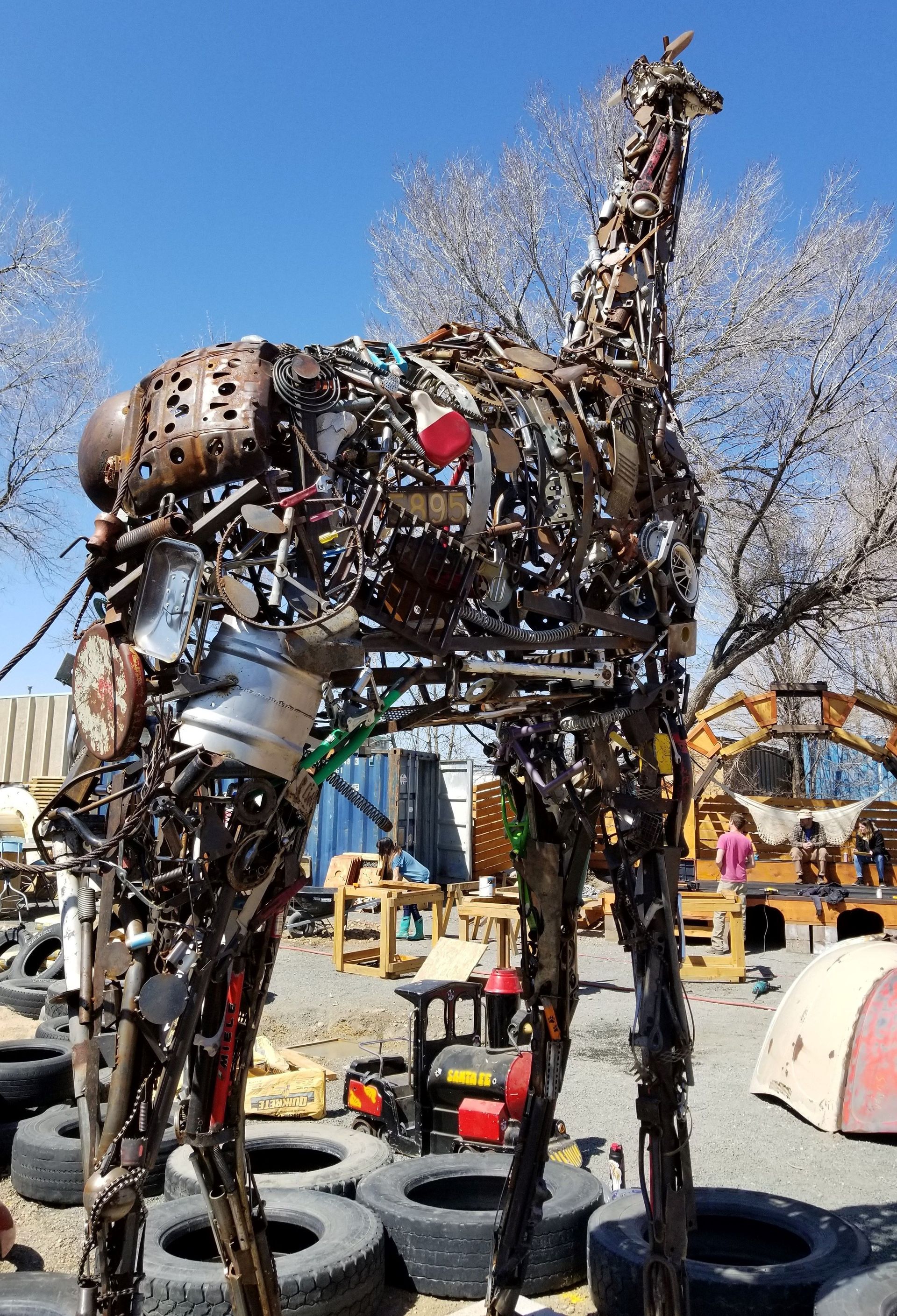 The Giraffe stands tall as a permanent testament to upcycling, creativity, and perseverance in the face of adversity. See it on Pearl Pkwy in Boulder, peeking over the fence! The Junkyard staff has been growing plants up the legs over the last few years, so eventually the sculpture will be fully enveloped in greenery.