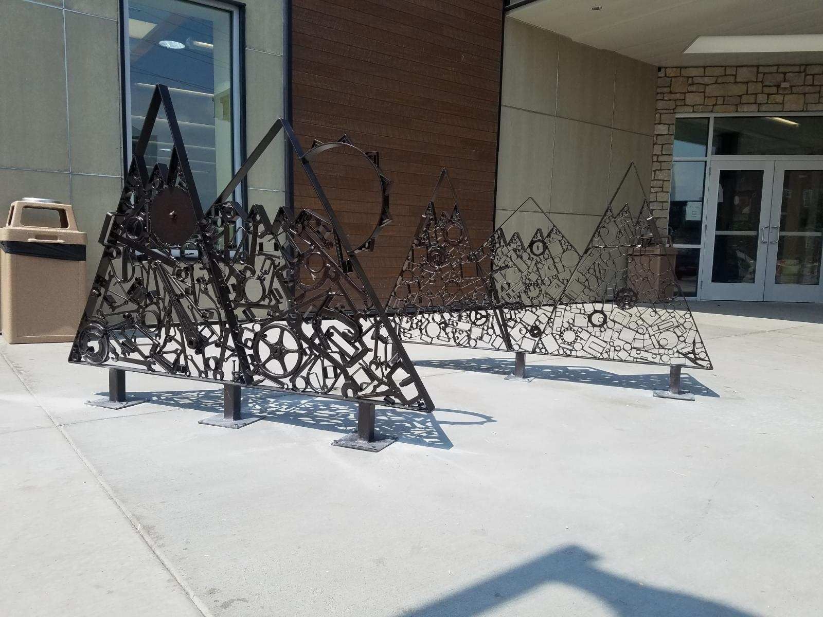 Mitch & Tim decided to create the bike racks in the shapes of mountains, and filled them with welded junk. They combine form and function, allowing for up to 6 bicycles to be locked to each. After a lot of leg work, Mitch was able to contact a number of local business owners who agreed to allow the racks to be placed in front of their businesses: